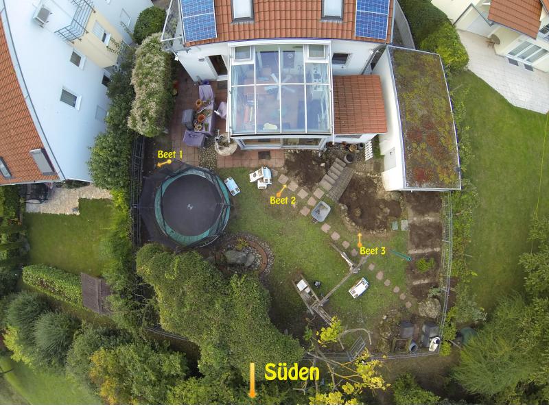 Beet 2 und Beet 3 liegen praktisch frei in der Sonne (nur bei sehr tiefer Sonne ev. im Schatten des Baumes?). Erst ab spätem Nachmittag wegen dem Nachbarhaus im Schatten.