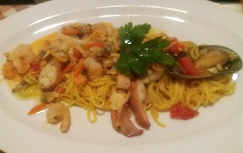 Hier gab es Spirellen mit Knoblauch-Tomaten-Soße (nachgereifte Tomaten, Knoblauch, Estragonöl, Creme fraiche, S&P) und Parmesan.