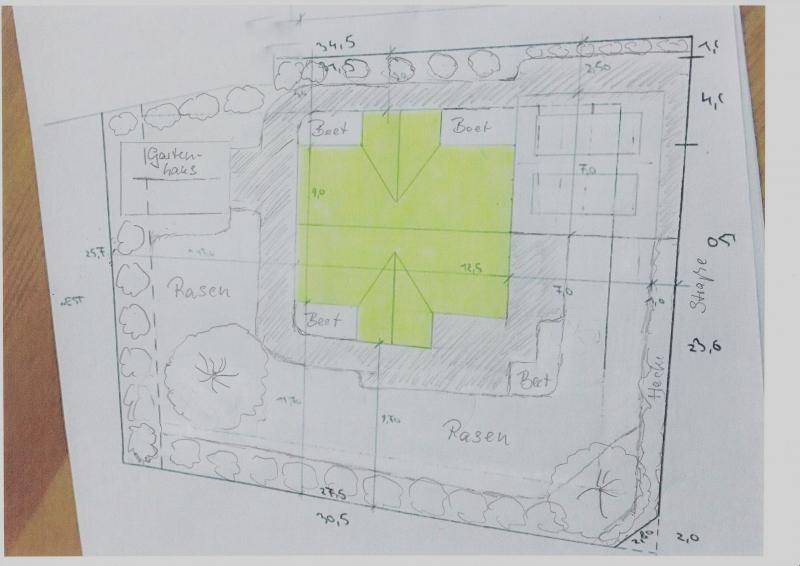 Zugunsten von großzügigen Rasenflächen für die Kinder werden sonnige Beete wohl zunächst recht klein ausfallen müssen. Die Frage ist, ob man wie auf der Skizze, die Grundstücksgrenzen mit einer Schnitthecke zur Straße hin und zu den anderen Grenzlinien mit Sträuchern bepflanzt, um nicht auf dem Präsentierteller zu sitzen.