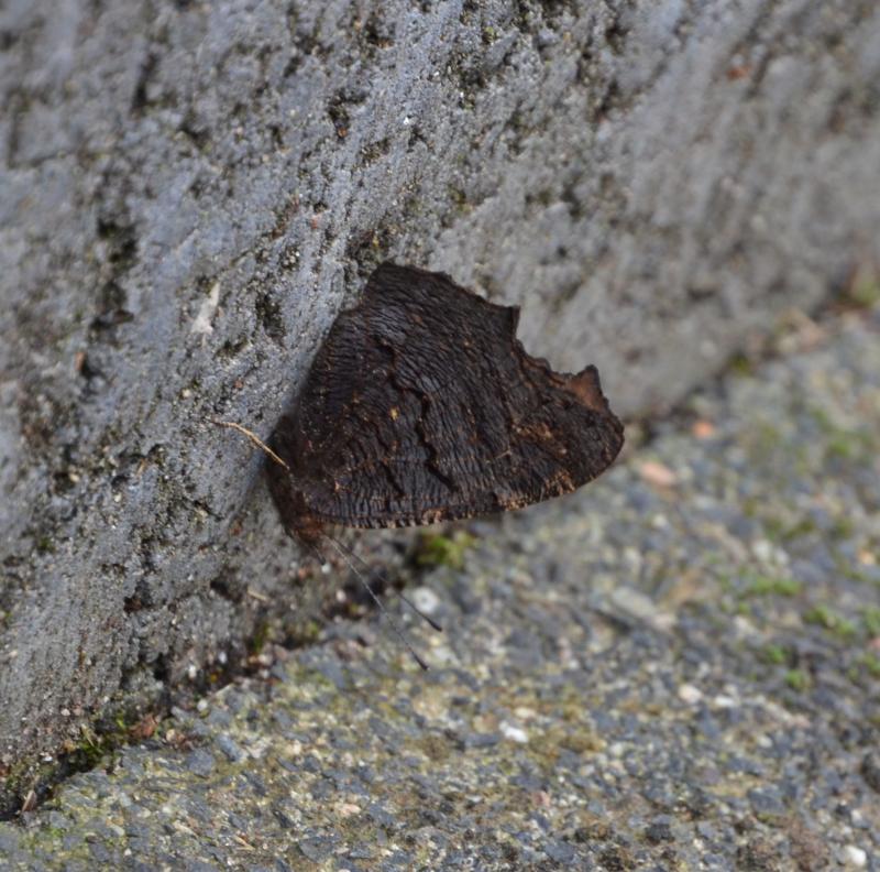 Seit mindestens einer Woche sitzt an einer Betonkante zusammengefaltet ein Falter (außen schwarz).