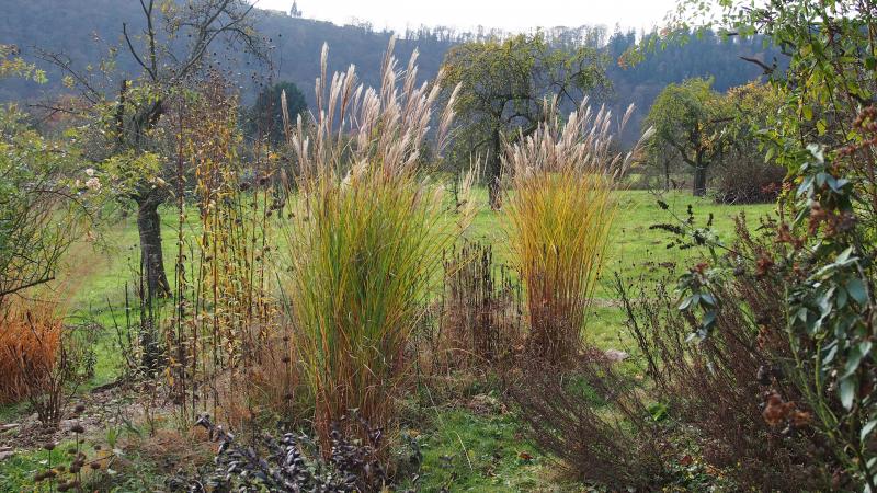 ... zu den beiden Miscanthus 'Grazillimus', die ich 2014 gepflanzt hatte und die ihre Blüten sehr hoch hinaus schieben.