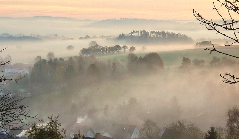 Die Sonne stiehlt sich über den Nebel, Kurpark Seebruck am 28.10.2016.
