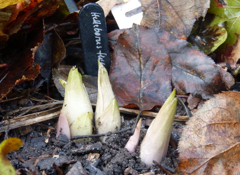 Hier ist Helleborus thibetanus schon wieder im Anmarsch. Die anderen vier Exemplare sind ähnlich weit.