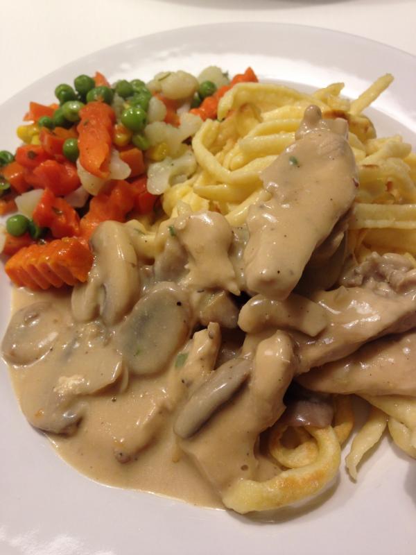 Hier gabs hähnchengeschnetzeltes mit Spätzle und buttergemüse.