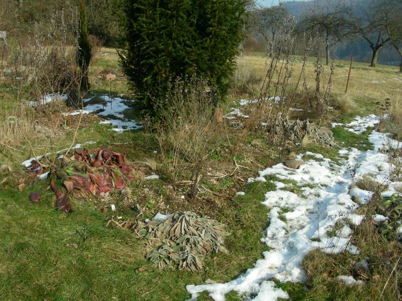 das Muster des Schnees jetzt ist Anhaltspunkt für die Einschätzung des Kleinklimas, der Bodenwärme und Trockenheit im Sommer. Die Bart-Iris und andere mediterrane Pflanzen sitzen alle in Bereichen, in denen jetzt kein Schnee mehr liegt.