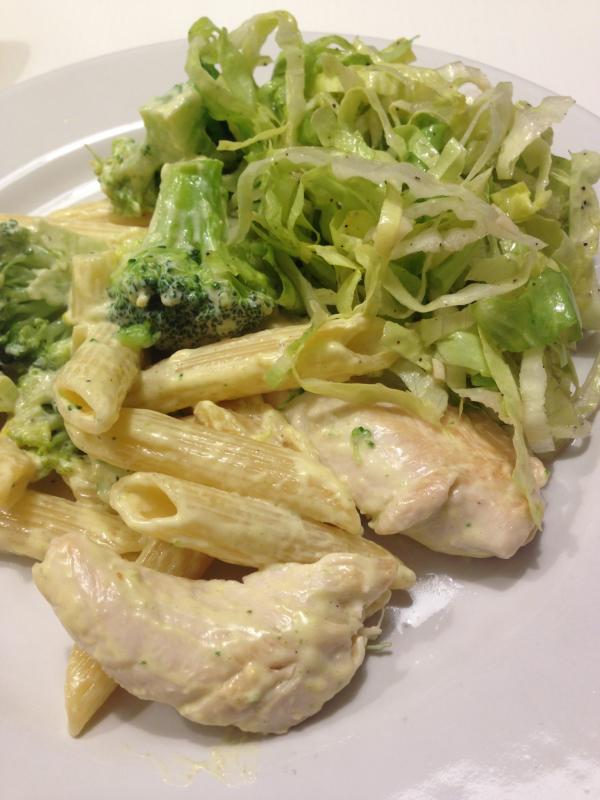 Gestern Nudeln, hähnchenbrust, Brokkoli und dazu zuckerhutsalat