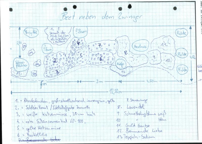 hi marco!sieht ganz passabel aus für einen ersten plan, deine skizze....die wuchshöhen hast du ja teilweise schon hingeschrieben, wenn ich das richtig lese... unklar ist mir deine frage nach den pflanzen/m2 ???zb fackellilien sehen anfangs recht unscheinbar aus, aber mehr als 2 stck/m2 kannst du da nicht setzten, denn sie wirken nur gut, wenn sie einzeln stehen und ihr durchmesser hat bereits nach einem jahr 50cm erreicht... nach 2-3 jahren musst du sie ohnehin ausbuddeln und teilen, sonst wird das zuviel des guten...so wird es wohl bei allen pflanzen sein; google mal nach deren breite (wird im ausgewachsenen zustand angegeben) und dann rechne es dir auf die von dir gewünschte fläche aus... anfangs wird`s dir wohl zu nackt erscheinen und du wirst uu mulchen müssen, aber wenn`s ende sommer zugeht, ist der meiste platz wohl schon zugewachsen...vergleich auch immer die bodenwünsche/lichtverhältnisse der gewählten pflanzen zu deinen bedingungen, nicht dass du böse überraschungen erlebst...grußfindling