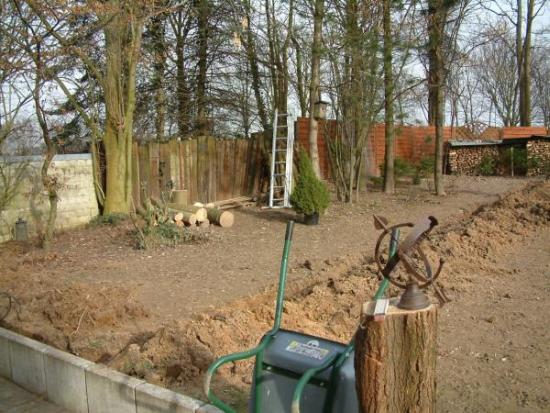 Hallo Tiarello, erst einmal herzlichen Dank für die Hilfe. Das kleine grüne Bäumchen im Beet ist eine Zuckerhutfichte, das noch keine neue Heimat gefunden hat. Ich lagere es dort z.Zt. nur zwischen, weil ich noch nicht weiss, wo es hinkommt. Der Baum mit dem Nistkasten ist die Kiefer. Die drei Fichten sind die letzten von insgesamt 97 Fichten. 94 haben wir einfach...erledigt, die drei hier wollte ich nicht unbedingt fällen. Der hintere Teil des Grundstücks war komplett mit Fichten zugebaut, alle waren nur noch in den Spitzen grün. Dieser Teil des Grundstücks ist neu hinzugefügt, als wir das Haus vor 1,5 Jahren kauften haben wir es günstig miterworben. Wir haben dann letzten Sommer die Fichten gefällt und einige Gehölze und Bäume umgesetzt. deshalb ist auch kein Rasen mehr zu sehen. Den hats bei den ganzen Aktionen zerlegt. Wir haben in dem Bereich, in dem die Fichten standen, einige Traktorladungen Mutterboden verteilt (etwa 20-30cm hoch, das Gelände wurde angeglichen). Die Idee mit der Kletterpflanze ist gut, werde ich sicherlich einbauen. Du hast recht, mir gefällt der Zaun nicht, zudem wollte ich etwas als Sichtschutz (mind. 2,20m hoch, über die ganze Breite) zum Nachbarn pflanzen, deshalb das Rhododendron. Den etwas krumm gewachsenen Baum (ich habe ihn noch nicht identifiziert, allerdings hängt jetzt noch das abgestorbene Laub vom Vorjahr daran...vieleicht Buche???) wollte ich stehen lassen. Der Sichtschutz soll genau rechts neben diesen Baum. Wenn ich nun das Rhododendron weiter noch vorne hole (Abstand zur Wand vielleicht 2,5 - 3m???) stände er ja mittig im Staudenbeet, kann man sowas einbauen? Ich könnte in diesem Bereich auch einfach das Beet etwas nach vorne ziehen, dann gnge es in jedem Fall. Hinter den 3 Fichten kommt der Teil des Gartens, der an eine Landstraße grenzt. Dort habe ich als Lärmschutz wieder Fichten, Tujas und einige Laubbäume (Ahorn, Eiche) gepflanzt. Dort sollte dann später ein schattiger Waldbeet- Bereich entstehen. Davor kommt dann irgendwann eine Hütte. Das Rhododendron könnte alternativ auch ganz links in das Beet, dort steht z.Zt ein Schneeball- Strauch, der aber vermutlich erkrankt ist. Den werde ich, wenn sich der Verdacht bestätigt, aus dem Beet entfernen. Dahinter steht (im Schatten) noch eine Foysitie, die ich nach der Blüte in einen sonnigen Bereich pflanzen wollte. Wenn ich nun das Rhododendron nach ganz links stelle, womit könnte ich denn dann noch einen Sichtschutz setzen, der mind. 2,2m hoch wächst und auch breit genug ist? Da fällt mir zur Zeit nichts ein, die Foysitie ist ja viel zu filigran und fällt damit als Lückenfüller aus. Ich setze noch mal ein anderes Bild des Bereichs ein, die Unordnung ist deshalb, weil wir zur Zeit alles umbauen und vieles noch keinen festen Platz gefunden hat. liebe Grüße, Marco