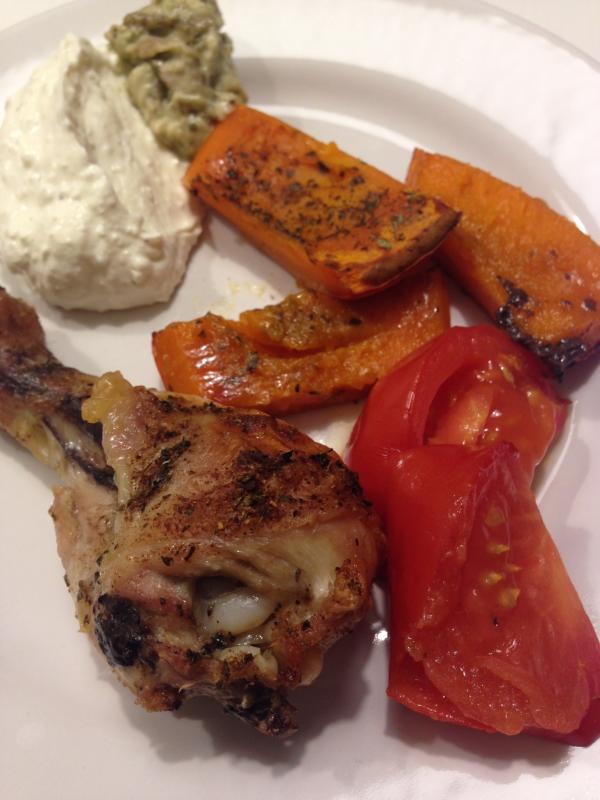 Hähnchenschlegel, Kürbis, Tomaten aus dem Ofen und schafskäsedip