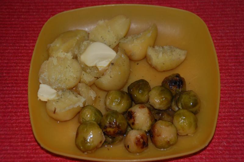 Pellkartoffeln (Rosara) mit Butter und Hawaisalz. Dazu Rosenkohl klassisch (scharf in Butter anbraten, mit Brühe ablöschen und nach dem Weichgaren noch Muskat dazu).