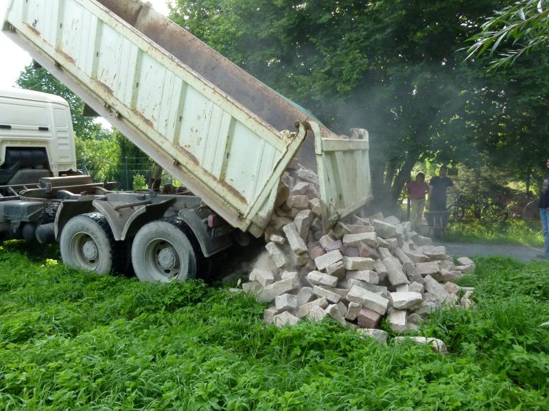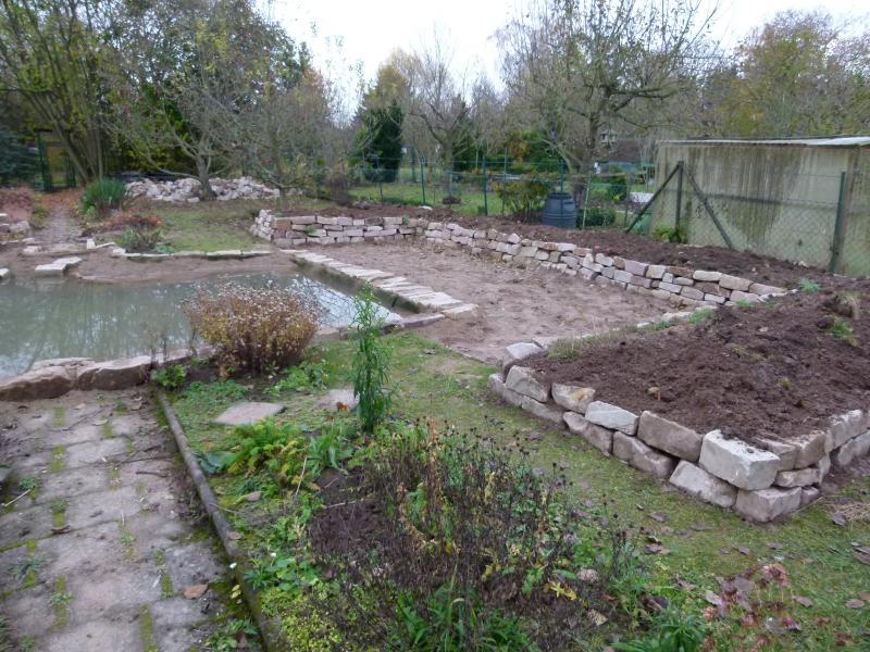 Schon vorher waren ja die Steine gebracht worden, die ich auch schon bei der Befestigung des Teichrandes verwendet hatte. Die meisten Steine dienen dem Bau der Mäuerchen als Hochbeete, um den riesigen Erdberg unterzubringen: