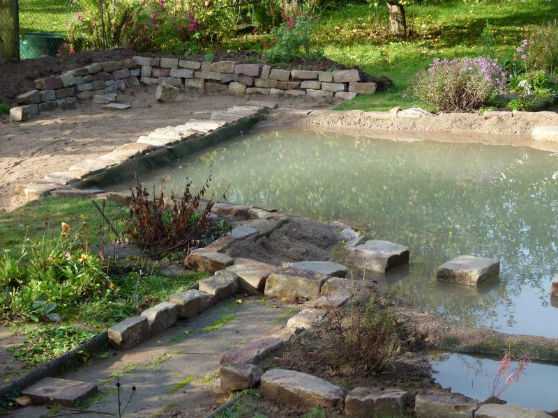Schon vorher waren ja die Steine gebracht worden, die ich auch schon bei der Befestigung des Teichrandes verwendet hatte. Die meisten Steine dienen dem Bau der Mäuerchen als Hochbeete, um den riesigen Erdberg unterzubringen: