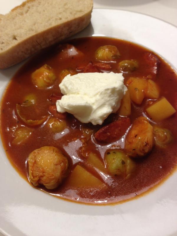 Zwiebel, Knoblauch, kabanossischeiben in Öl anbraten. Tomatenmark und Oregano dazu. Mit Brühe aufgießen. Rohe kartoffelwürfel und geputzten evtl halbierten Rosenkohl dazu, 12-15 min köcheln lassen bis alles gar ist. Mit Salz und Pfeffer abschmecken, mit Sauerrahm und Baguette servieren :)