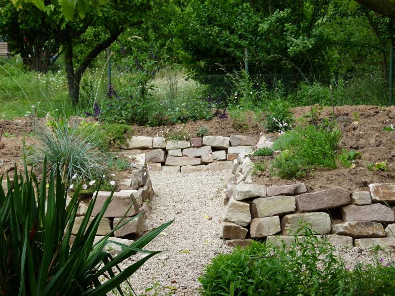 ja die Steine habe ich einfach aufgestapelt. Sie gewinnen Stabilität, indem sie sich ein wenig zurücklehnen an die Erde im Beet.