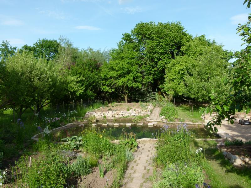 Der Teich wirkt wie mitten reingeklatscht. Man merkt dem Garten die alte Schrebergartenstruktur einfach noch zu sehr an. Der Mittelweg läuft stur durch den Garten und der Teich wirkt nur wie eine seltsame Unterbrechung.
