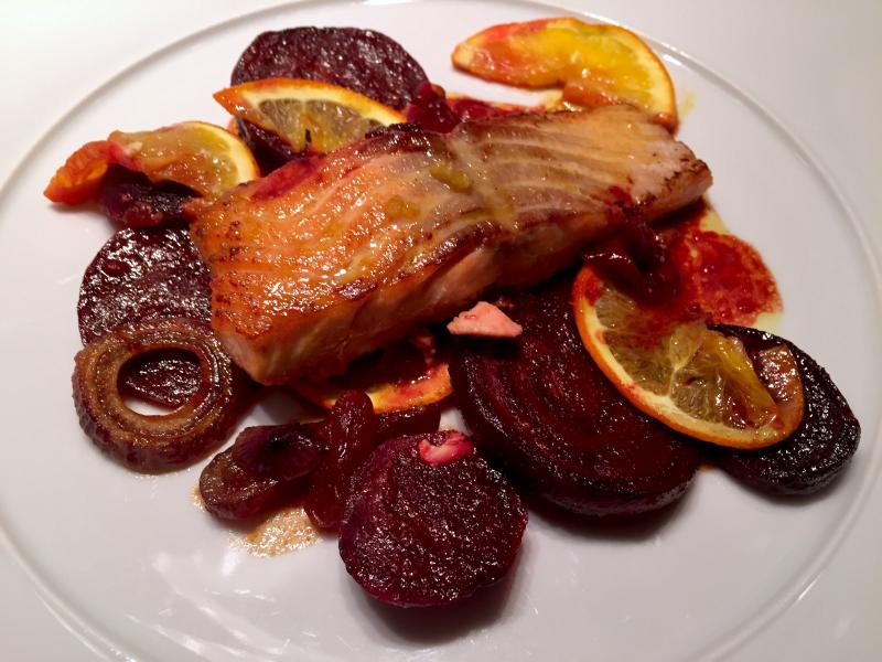 es gab lachsfilet mit randen, roten zwiebeln und orangen aus dem backofen