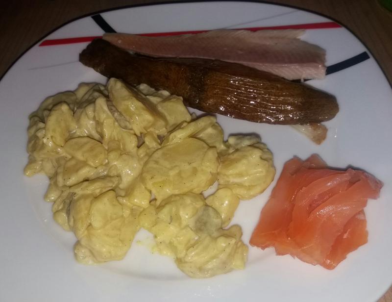 Hier gab es gestern Kartoffelsalat mit geräuchertem Lachs, Heilbutt und Forelle, dazu einen grünen Salat mit Tomate und Gurke.
