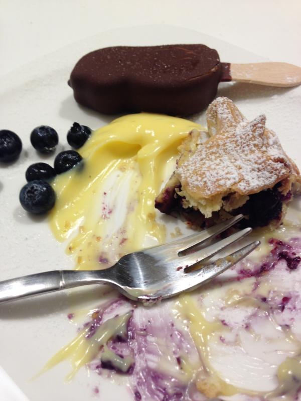 Heidelbeerstrudel mit Vanillesoße und minieis