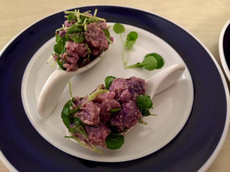 erst türmte sich der gruß aus der küche zu unanständig üppigen gierschlundhappen (gartenkartoffelsalat mit brunnenkresse)...