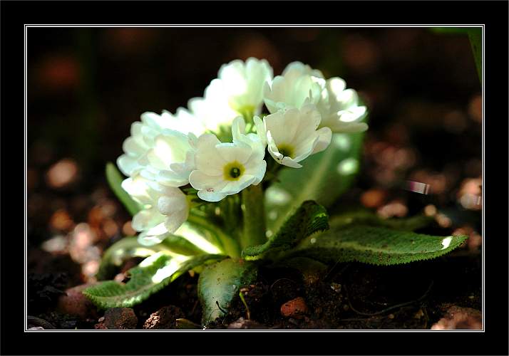 Penny, der Trick ist die Natur. Die Primel steht unter einer Azalee und hat somit sehr viel Schatten, aber zum Zeitpunkt der Aufnahme Mittagssonnenstrahlen. Insofern der dunkle Hintergrund mit den "Lichtern"LG FrankHallo Frank,wie kommt der dunkle Hintergrund bei deinem Primelbild zustande? Sieht hübsch aus mit dem Rahmen. Gibt es da einen Trick?Gruß Penny