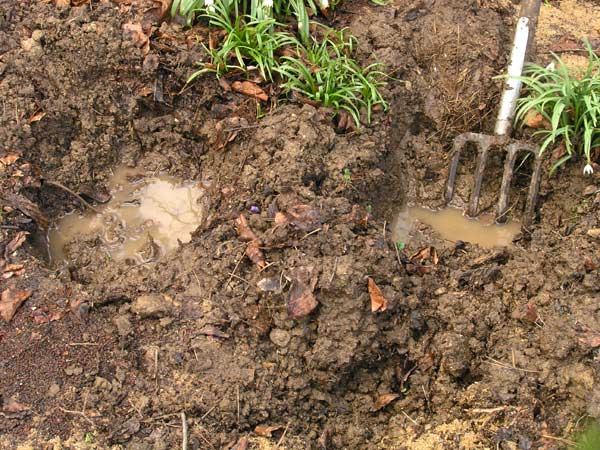 Ich bearbeite auch gerade solch ein Beet, auf dem Foto siehst Du, wie es letzte Woche aussah. Jetzt ist es etwas abgetrocknet. Ich habe das Beet umgegraben, dabei jede Menge große Steine z.T. mit der Spitzhacke ausgegraben, darunter ist wahrscheinlich verdichteter Boden vom Bau des Hauses, es wird also weiter Staunässe dort geben. Ich habe viele Eimer Sand, Lavasplit und Kompost eingearbeitet. Es können aber nur feuchtigkeitsliebende Pflanzen dort gedeihen und so wird es bei Dir auch sein.