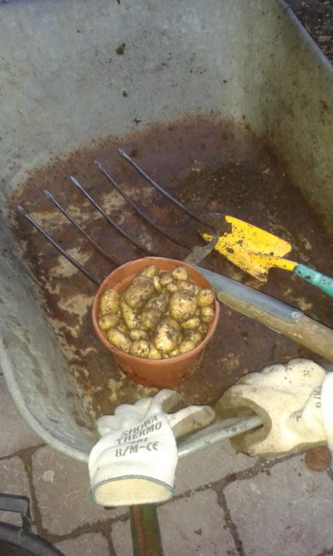 Für Großfamilien lohnt das sicher nicht, aber es macht Spaß. Die Kübel waren vorhanden und die Erde auch. Dass Gießen hielt sich in Grenzen. Wenn ich dran denke, werde ich das im kommenden Jahr wieder machen. Wenn das Saatgut in besserem Zustand ist, als es diese HutzelKartoffeln waren, wird die Ernte sicher auch besser ausfallen.