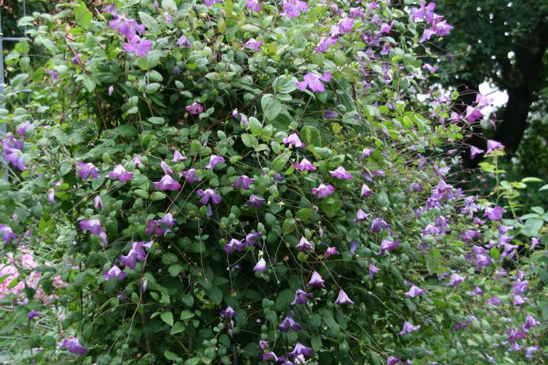 ich suche auch nach einem Sorten-Namen. Diese Clemtis viticella habe ich 2003 an einer Gastentür gefunden, von der aus sie bis in ca. 3 m Höhe in einen Baum rankte, über und über mit diesen kleinen blauen Glockenblüten bedeckt. Die sind nur ca. 5 cm groß - kann man mit dem Maschendraht gut vergleichen.