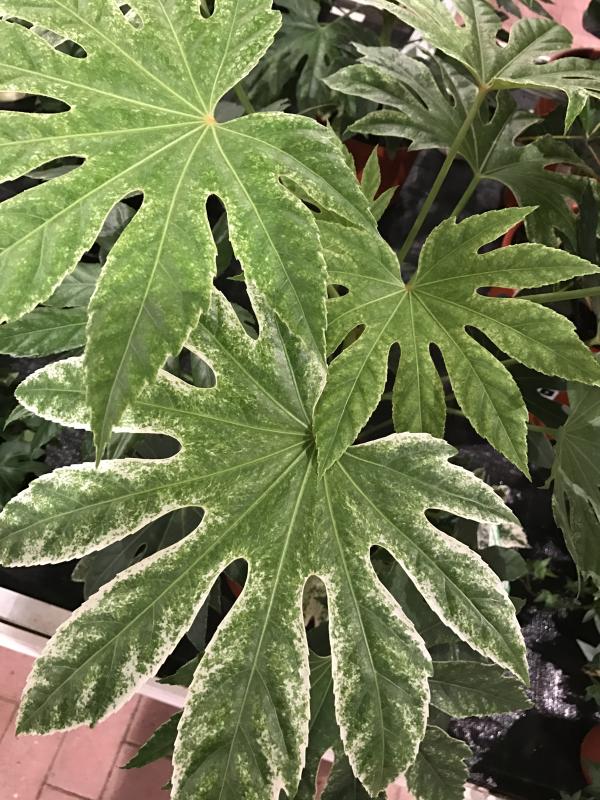 Beim Biberbaumarkt standen einige kräftige Exemplare von Fatsia 'Spider's Web'. Es ist zwar die denkbar ungünstigste Zeit, aber vielleicht mag jemand zuschlagen und die Pflanzen drin überwintern. ;)
