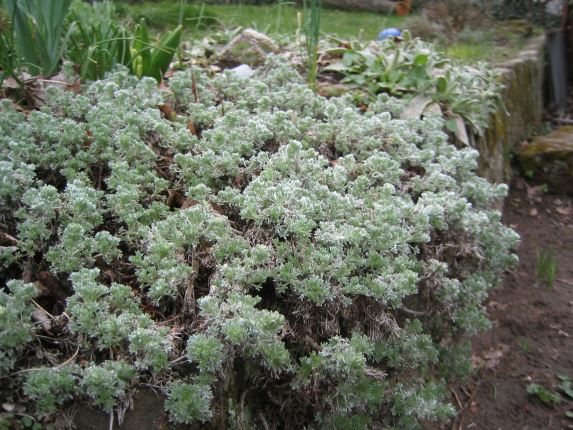 Und jetzt mal eine Frage an die Experten:Als ich den Garten übernahm habe ich ein winzigkleines Polster einer Artemisie vorgefunden. Es war fast völlig von dem ständig anwesenden Sedum reflexum überwuchert. Ich habe das Fleckchen befreit, gehätschelt und gehegt. Nun habe ich es bereits an mehreren Stellen im Garten gepflanzt.Ich dachte immer es sei A. schmidtiana, aber meine Unbekannte zieht im Winter nicht ein, sie bildet regelrechte Matten, welche fast Weiß wirken, das Laub ist sehr fein und die Blütenstände richtig 'goldig', nein auch weiß. Aber Rispen vereinzelter etwa liebesperlengroßer, kugeliger hängender Blüten, etwa 10 cm hoch. Kann mir jemand weiterhelfen?