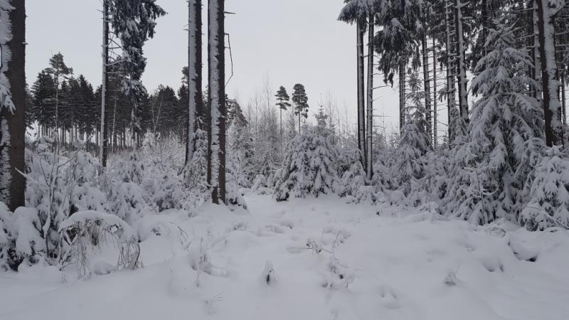 -7°C aktuell, ganztägig stark bewölkt, gerade von Spaziergang durch schön verschneiten Wald zurück