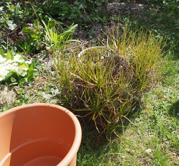 In dem Topf waren ursprünglich 8 Pflanzen. eine hat wohl diesen Winter nach mehrfacher Teilung aufgegeben. Ich habe das kleine Bäumchen rausgezogen.