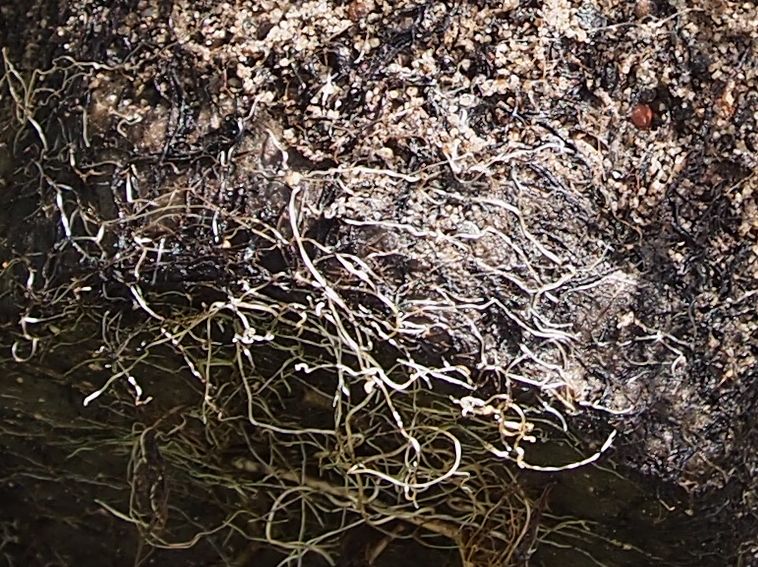 Beim Betrachten des Fotos in der Vergrößerung ist mir an den Wurzeln aufgefallen das da viele Verdickungen sind. Vielleicht ein Anzeichen für Mykorhiza?