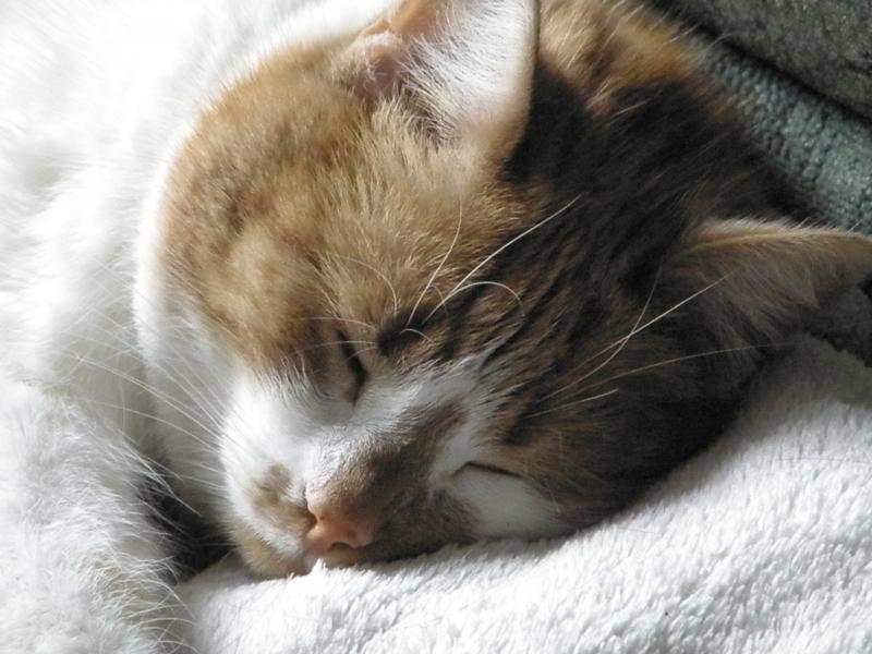 Liese muss wirklich was vermisst haben. Die hat die ganze Nacht bei mir im Bett verbracht, bis auf gelegentliche Ausflüge zur Futterschüssel, und die letzten zwei Stunden vorm Aufstehen hing sie mir um den Hals, Stirn an Stirn und Nase an Nase. Jetzt ist si so erschöpft, dass sie wie ein Murmeltier schläft.