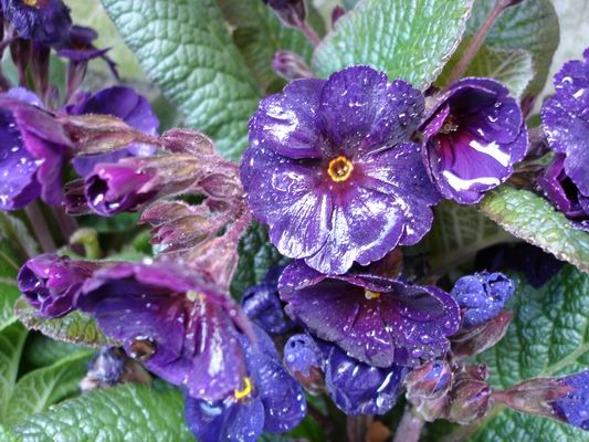 Obwohl es heute dauernd geschauert hat, habe ich noch ein paar Fotos von meinen Primeln gemacht, die ich in der letzten Zeit gekauft habe und die nun aufs Eingepflanztwerden warten (??weiß man ja nicht so genau??). Allerdings sind sie nun auf den Bildern klitschnass, den Samteffekt müsst Ihr Euch dazudenken.Es sind eigentlich von der Gärtnerei so genannte Staudenprimeln, also "ganz normale" polyanthus (wie die Briten wohl sagen würden); aber ich finde sie farblich einfach Spitze. Sie ähneln, wenn ihnen das gelbe Auge fehlt, z.T. den Cowichan von Barnhaven, aber die haben meist kleinere Blüten (was ja auch sehr hübsch ist, ich habe welche selbst gezogen, aber die blühen noch nicht).Hier erstmal eine blaue: