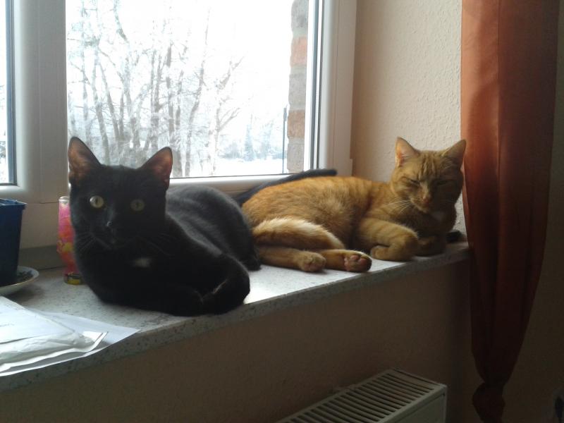 Willi und Poldi wärmen sich das Bäuchlein auf der Fensterbank