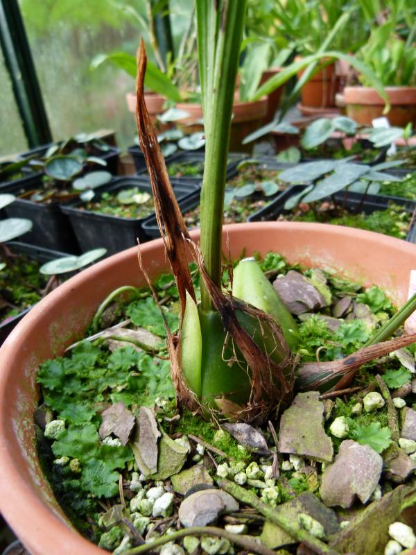 Nach der ersten Vegetationsperiode bei mir: Pleione grandiflora. Ich wundere mich, dass jetzt schon so deutliche neue - ja was? Knospen oder neue Triebspitzen? sichtbar sind. Bei den zwei anderen Arten, die ich habe, ist im Herbst nicht so viel zu sehen.