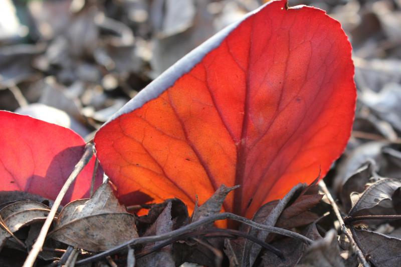 Wir hatten ja die ganze Woche lang Kahlfröste. Aber die Sonne hat ganze Arbeit geleistet und meine Bergenien "Winterglut" (Samen von Jelitto) kräftig eingefärbt: