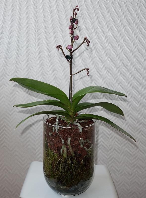 Diese Mini-Phalaenopsis habe ich für eine liebe Bekannte umgetopft und dann ein Jahr bei mir gepflegt. Sie hat die alten Blätter im Laufe des Jahres verloren, aber zwei neue gebildet.