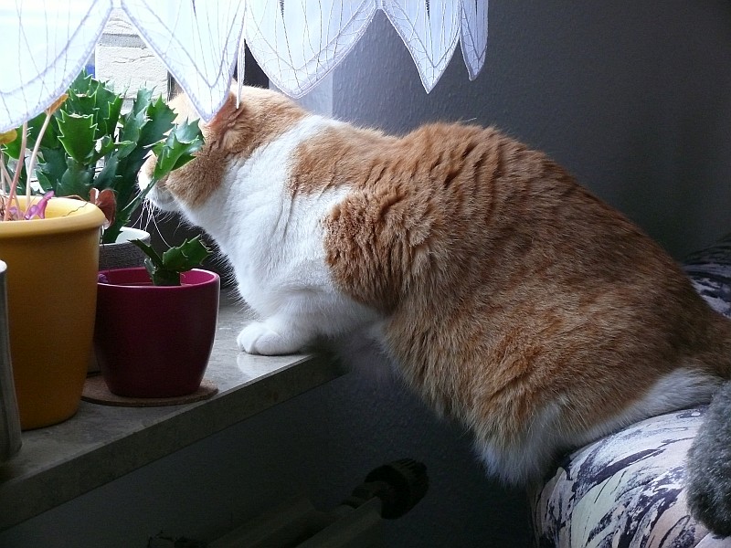 Speedy dagegen frißt 1. viel weniger, 2. nascht sie gern - und zwar alles: von Kuchen, Quarkdose auslecken, die Gelatine vom Schlemmerfleisch, Nudelreste, Puddingreste, Sprotten - also einfach alles. Dafür geht sie n i e m a l s ans frische Fleisch und erfordert sich Milch.