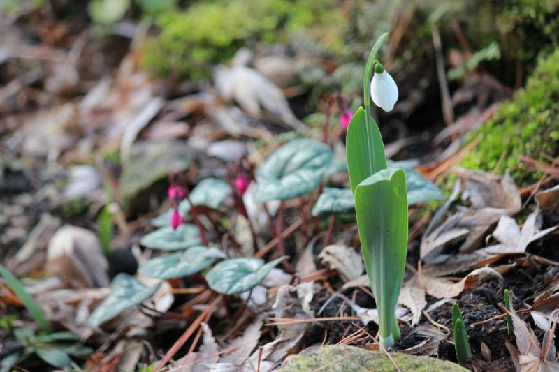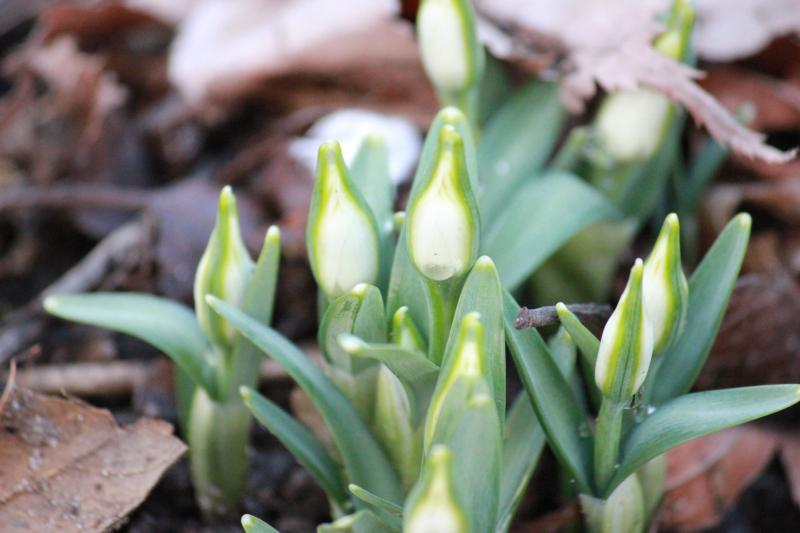 Hier blühen zwei No-names, die letztes Jahr schon Anfang Dezember geblüht haben. Weit fortgeschritten sind in meiner Shakespeare-Ecke die Greatorex-Glöckchen. Aber auch hier sieht man Unterschiede. Bei 'Jacquenetta' sieht man Blütenknospen, bei 'Hippolyta' und den anderen sind es nur grüne Spitzen. Die sind hier allerdings gelb, weil sie bisher mit Walnusslaub bedeckt waren.