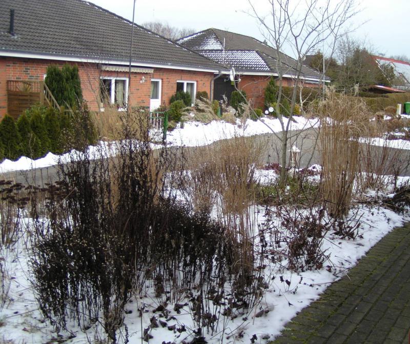 Eisiger Ostwind schon seit Tagen auch hier kurz vor Dänemark - und etwas Schnee liegt schon seit letzten Sonntag. Heute hatten wir erstmalig tagsüber Plusgrade in dieser Woche (+2,3°C). Ab nächste Woche soll es wärmer werden, vielleicht können wir dann im Vorgarten mit Stauden/Gräserrückschnitt beginnen...