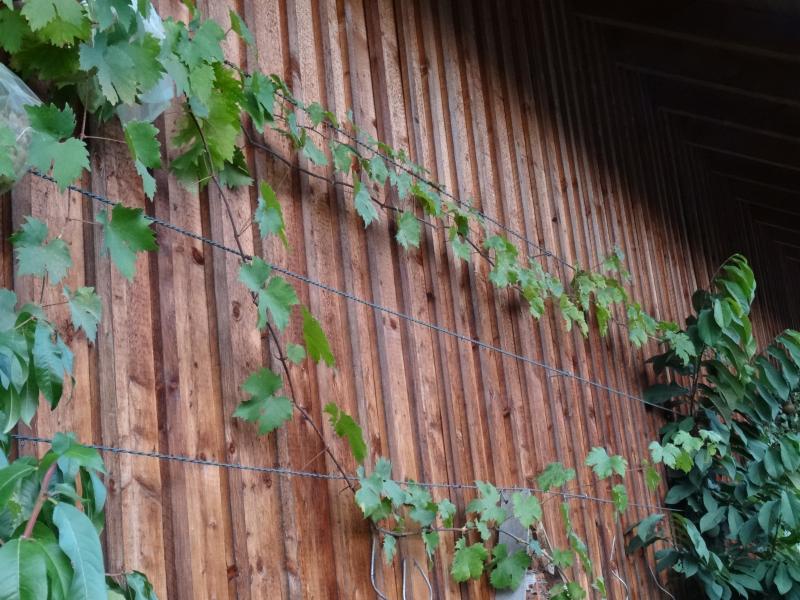 Die Rebe ist überbaut. Eigentlich würde ich sie massivst zurückschneiden wollen, damit ich an den unteren Drähten was entlang ziehen kann. Dann könnte ich den Austrieb der Bogrebe auch nach oben hochbinden.