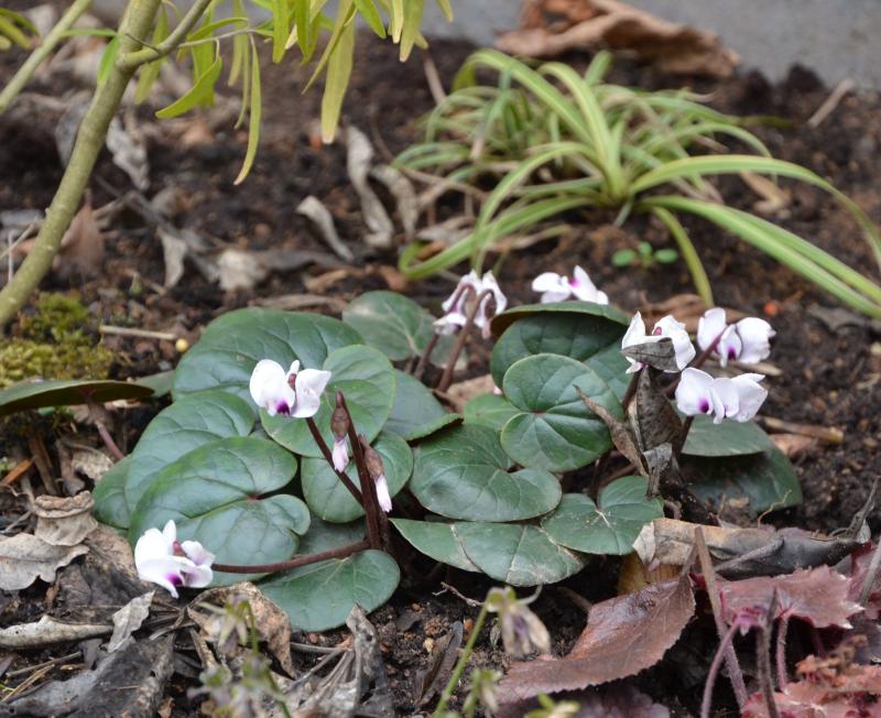 Cyclamen blüht schon länger, trotz der Kälte (das Beet ist aber auch erhöht). Die Schneeglöckchen machen sich startklar, sind aber noch nicht ganz offen. Knospen gibt es auch bei Helleborus, aber mehr noch nicht. Den Winterlingen ist es vermutlich zu trocken, auch die Krokusse warten noch.