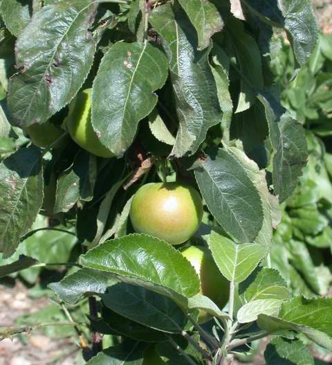Und hier noch ein Bild von den Aepfeln, mhm fein. ::)Der Maschendraht ist wegen den Katzen, die die Säulenbäume sehr gern als Kratzpfosten benützten. Leider wuchsen auch ein paar Aepfel durch den Draht durch
