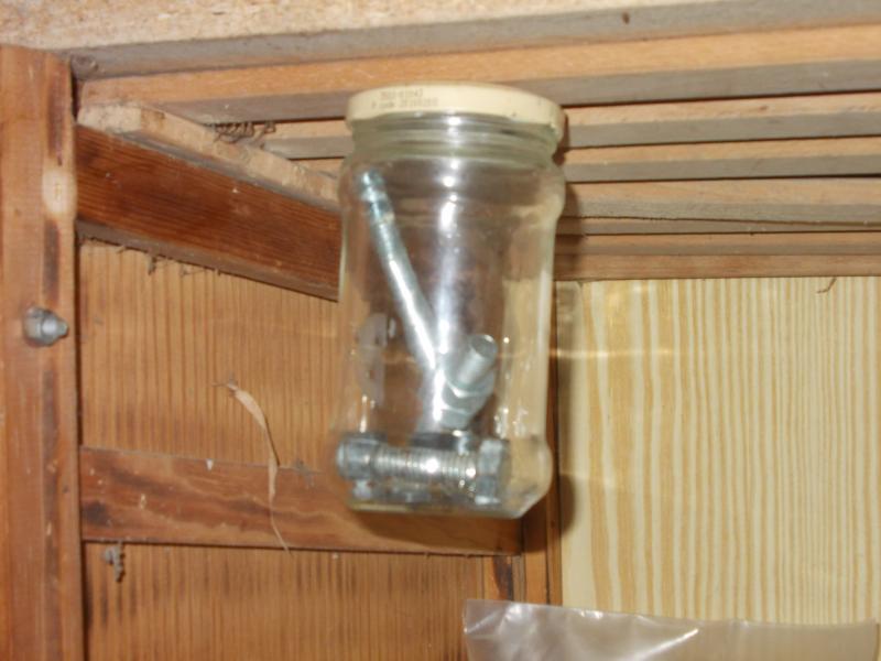 Hier hab ich mal ein Foto von einem Glas, von dem wir den Deckel ans Regal geschraubt haben. Das Glas kann man z. B. mit Schrauben o. A. füllen. Die Werkbank wird nicht vollgestellt und man sieht gleich, was drin ist.