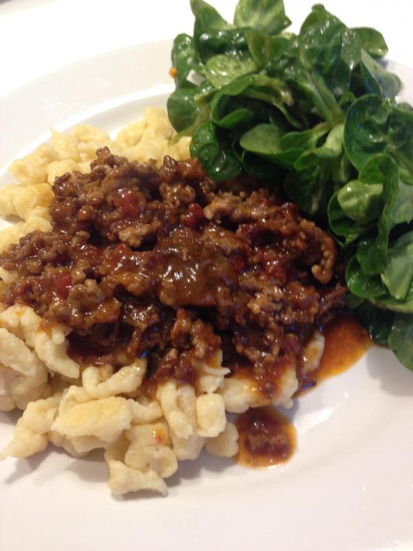 Ich hatte noch ochsenschwanzsoße eingefroren. Hab also Hackfleisch angebraten, die Soße drüber gekippt und auf Wunsch des Sohnes Spätzle dazu gemacht. Ackersalat gabs auch noch.