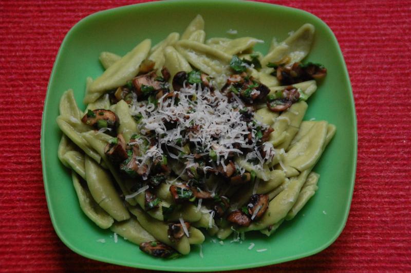 Bei mir gab es heute grünes Essen: Foglie d'ulivo agli spinaci (Was auch immer das heißt ::) - ich vermute mal "Spinatnudeln") mit braunen Champis, Zwiebeln und Petersilie. + Parmesan.