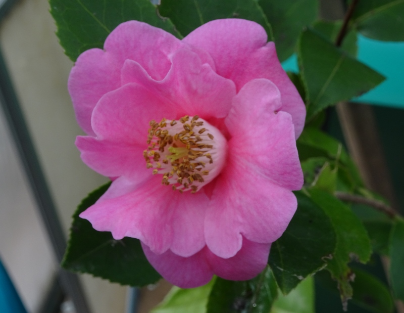 Camellia japonica Shuko-No-Tsuki . Ein besseres Bild. Die andere war schon am Verblühen. Man sieht hier auch die Marmorierung, die von Blüte zu blüte unterschiedlich stark ist.