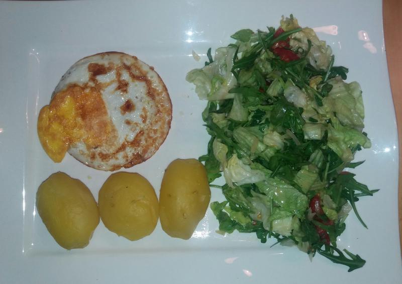 Hier gab es heute Spinat, Reis und Kabeljau mit Himbeersenf und groben Semmelbröseln paniert und gebraten. Wie es schmeckte weiß ich nicht, ich hab heute mal freiwillig einen Fastentag probiert und mich von Brühe, Tee und Selter ernährt :-\.