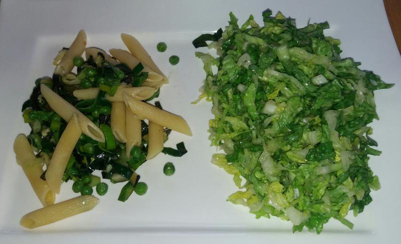 Penne mit 4 Grünen Gemüse: Erbsen, Zucchini, Pak Choi und Lauch,
